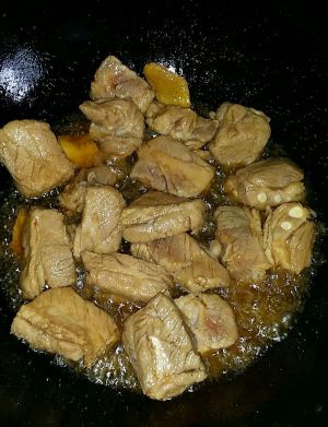 捞出排骨下锅翻炒,炒至肉变色收紧。