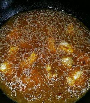 加入腌排骨的汤汁、生抽、葱蒜、白糖继续翻炒大约10分钟。