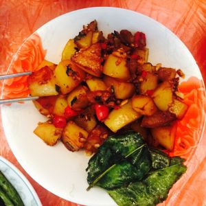 平底锅,油烧热,先爆香花椒粒和干辣椒,随后先倒入煎好的土豆丁,稍微翻炒,即倒入秘制酱料,加入一点点凉水至土豆丁体积一半的部分,盖上锅盖,焖3分钟左右至酱汁收干,可按个人喜好加入孜然粉或者黑椒粉等收尾