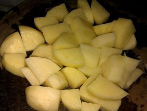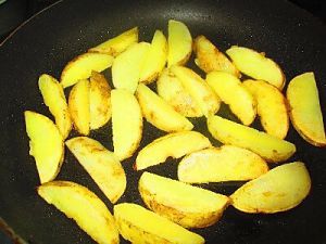 平底锅放油,烧热,小火,炸煎土豆丁,煎到土豆丁表面微微焦黄,大概需要3~5分钟