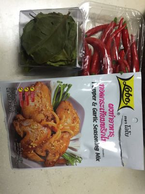 调制秘制酱料:生抽,蚝油,大片的生姜块,香葱末,白砂糖,盐,切碎的小尖椒,泰式鸡调味粉,薄荷叶两片(调味粉以及薄荷叶如图所示,均为泰国本地超市购买,没有的菇凉们可以去万能的宝淘一淘或者用咱们本土的其他方便购买的调味粉代替,例如孜然粉类)