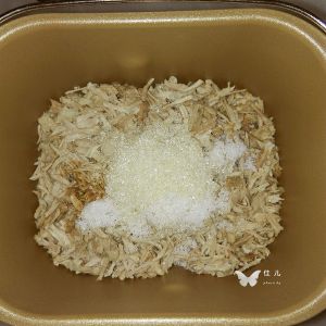 擀好的肉丝放入面包机的内胆,加入酱油、盐、白糖、玉米油等调料。