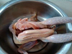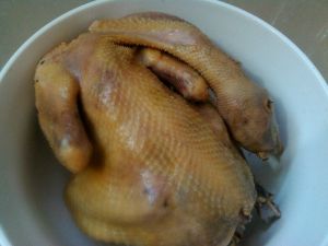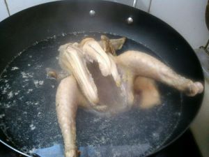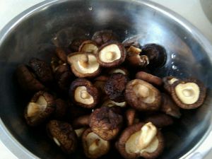 焯完水稍冷却后(以不烫手为宜),将盐均匀地涂抹于鸡的全身,肉厚处可多抹些。将小香菇塞进鸡肚子里,装入大碗中,什么都不放了,上高压锅蒸。
