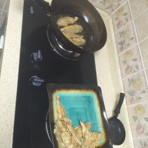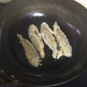 油温大约8成时候下锅,大火把鱼正反面炸定型,然后换中火炸透。取出来等待第二次复炸