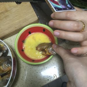 两颗鸡蛋、打散、小黃魚醃製好了之后在蛋液中滚一圈!每只都这样哦重复一下