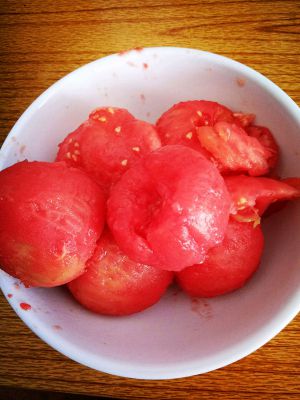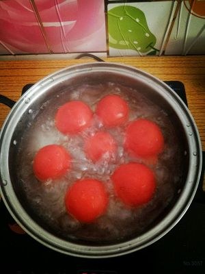 把洗净的番茄放入烧开的水里烫到裂皮,