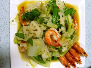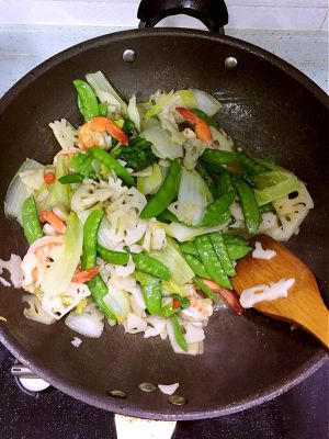 先入藕片翻炒一下,随后加入虾,荷兰豆,娃娃菜,生菜,倒入用虾头炸好的虾油,翻炒一下后,加入盐,糖,味精,一点料酒调味,翻炒一下淋几滴香油出锅
