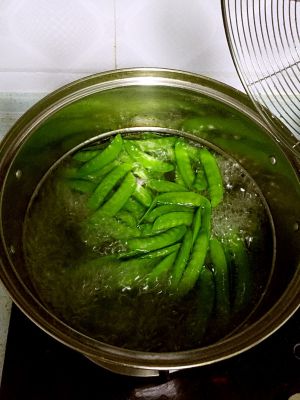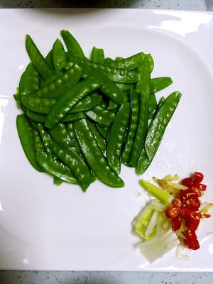 荷兰豆飞水,水里加盐,食用油,出锅迅速过凉,以保持鲜艳色泽
