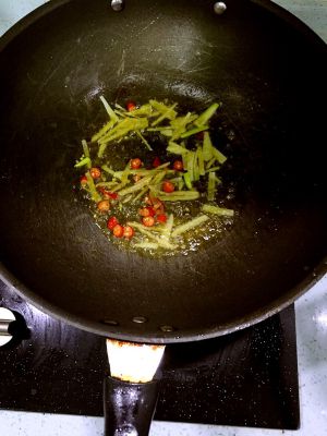 过凉的荷兰豆控水备用,切两个小米椒,一点葱姜