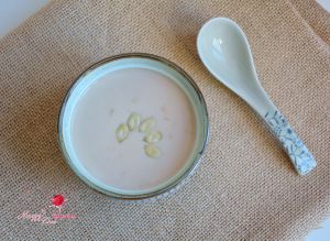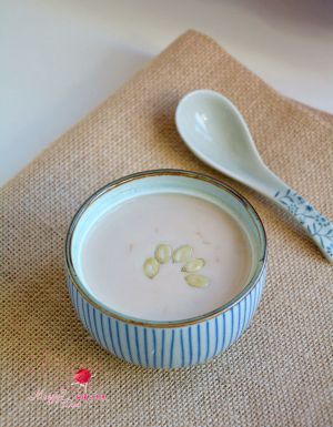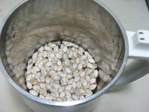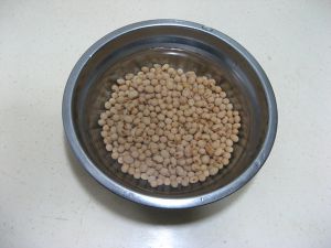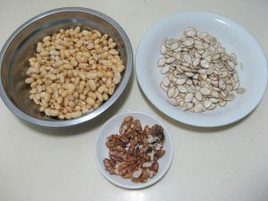 泡发好的黄豆、四个剥皮的核桃、清洗干净的带皮南瓜籽准备好