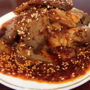 把调好的辣椒油浇在切成片的蹄膀上即可食用!