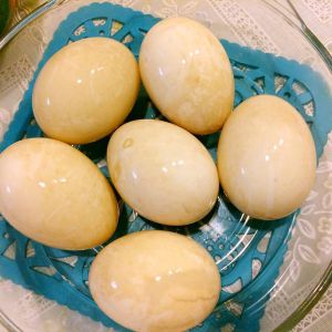 将浸满酒液的鸭蛋放入玻璃保鲜盒里。
