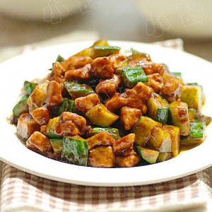 倒入肉粒炒匀,使每粒肉丁都裹上酱汁,然后倒入黄瓜丁,快速翻炒均匀,最后淋入香油提香即可。