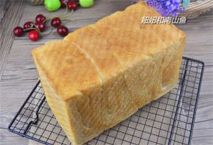 10、 预热烤箱,中下层,上火145℃,下火165℃,烤30分钟,出炉后需敲打桌面数次,再将面包取出,放凉后切片。
