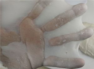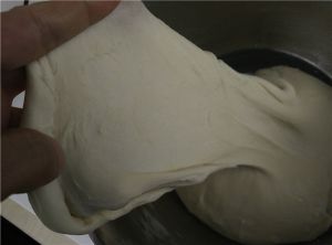 揉搓至在面团到达扩展状态时,加入黄油,继续揉面至黄油完全吸收,再重复搓衣板式揉面,揉至面团可以拉出薄薄且不易破的手套膜时,即为完全扩展阶段;