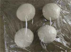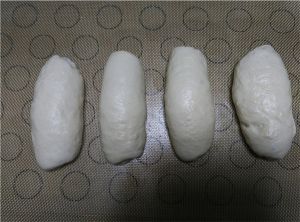 将发酵完全的面团拍出气体,分成4等份,逐个滚圆,已经存在在面团中的空气不必过度排挤掉,不要破坏面筋的连续性,盖上保鲜膜,常温下松弛15分钟;