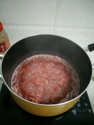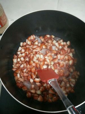 将腌制好的草莓放入不粘锅,加冰糖。小火,慢慢熬吧~需要缓慢的搅拌哦!