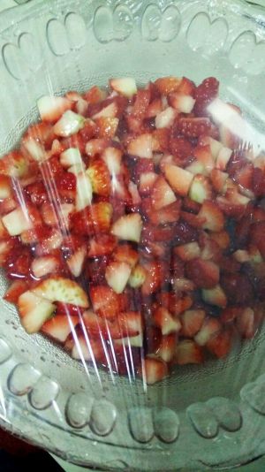 草莓切小块,其实可以把白的那部分去掉的,熬的时候有点拖时间了。然后加入白糖,拌匀,腌制一个半小时。
