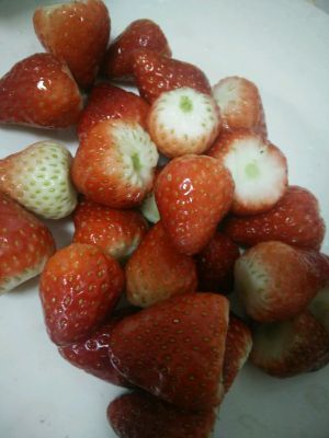 草莓洗干净去蒂。。。。(一定要仔细洗干净。我用了点面粉轻轻冲洗的。)