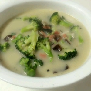 倒入西兰花煮和香菇煮沸腾(西兰花已经熟了),然后再加入皮蛋和火腿,再煮上3-4分钟!不然皮蛋的味道出不来!