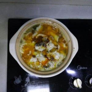起油锅,放姜,蒜爆香,放鱼谷炒一下,加开水炖