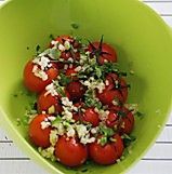 取出烤过的番茄,撒一层大蒜和香菜,继续烤5分钟左右即可。把生抽,醋,香油以1:2:0.5的比例拌匀后浇在番茄上即可。