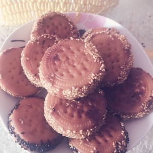 准备小碟滚一圈芝麻,注意南瓜馅的厚度大概两个奥利奥饼干后度