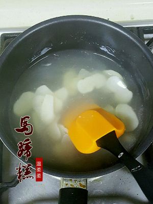 煮至水开后加入3/1的马蹄粉浆,搅拌,使产生粘性,注意不要有疙瘩。