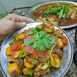 先三层肉烫开水30-1分钟捞起水分沥干,锅烧热下油@姜蒜!后下白糖翻炒下三层肉,酱油,翻炒片刻,等肉变红放耗油板栗加水淹没量为准,先大火炖5分钟后加胡萝卜改中火炖5分钟加各种调味待汤收汁差不多,板栗也熟下葱花关火即可)