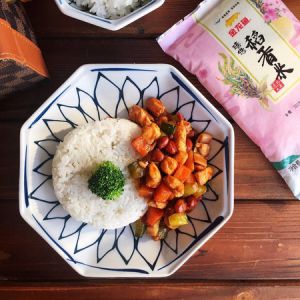 把米饭盛到盘中,再把宫保鸡丁盖到饭上,哈哈,一盘诱人的鸡丁盖饭就好啦。