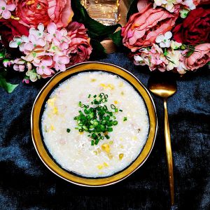 煮制米粘稠,丢弃老姜,加点鸡粉,就可以关火啦~煮制期间最好不要离开,要经常搅拌,避免糊锅~