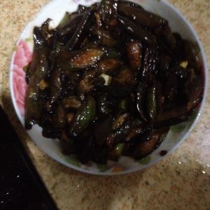 茄子进去翻炒,翻炒一会焖锅盖,途中打开翻炒下,看茄子扁了,大概熟了,放生抽一勺半、料酒一勺半、老抽半勺(着色)、糖一勺不到。
