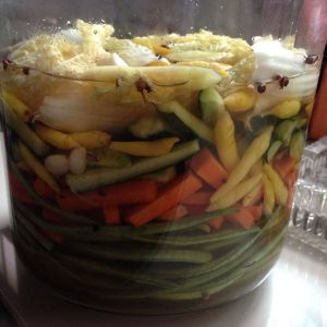 把泡菜坛子开水洗净晾干后,先将杠豆盘好放入最底层因为杠豆不好熟,然后再放点事先备的姜和蒜小米椒,然后依次放入胡萝卜,黄瓜,注意每放一层都放点姜蒜米椒,容易更好入味,比较好熟的放最上面,我家还有点娃娃菜我就放在最上面一起腌制。
