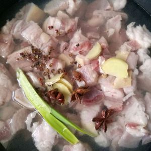 五花肉切块,冷水下锅,加入生姜大葱花椒八角料酒,烧开几翻捞出。
