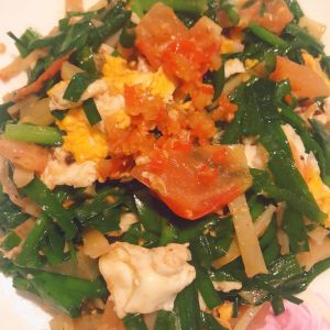 热锅放油,依次炒蛋、瑶柱、土豆丝和蕃茄粒