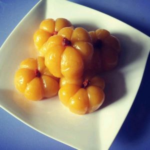 把面团分成一个个小面团,然后利用牙签压制出南瓜的纹路,再点缀枸杞在上面