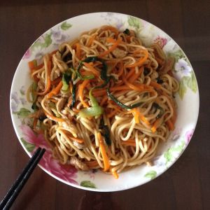 锅里放适量油,倒入萝卜丝,炒软,倒入青菜,面一起炒片刻,放入之前炒好的肉丝,放入盐和生抽,按个人口味放辣椒酱,一起炒,如果面粘锅可以倒入少量水