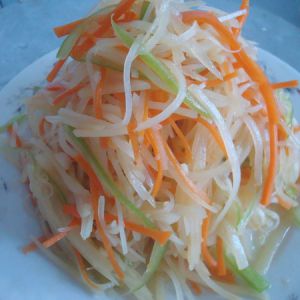 把控干水的土豆丝~胡萝卜丝~青尖椒丝~加蒜末和所有调料~拌匀!~