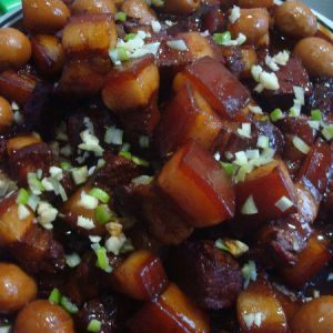 锅在加点底油~在放些糖~炒化后加入肉快~快速翻炒~让糖浆包住肉块~加料酒~(个人感觉加白酒味道更好)加老抽适量~翻炒上色~加热水~把葱段~姜块~蒜瓣加入~把香料打成包也加入~加炒好的糖色~用酱油在调下色~加盐~冰糖~白胡椒粉~调好味道后~小火慢炖~其实红烧肉没有什么时间概念~中国人讲究慢工出细活~用在红烧肉上是在合适不过的!~小火炖的时间越长越好·!~我用了快一个小时~记的我上海的姐夫~做这个菜~用三四个钟头~呵呵那煤气费让我姨心疼了好一会哈!~