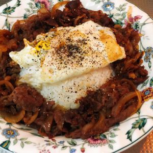 然后煎一个鸡蛋,通常都是半熟蛋,撒上黑胡椒,就可以啦!