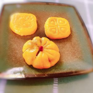 倒入适量的糯米粉,少量面粉,加点白糖做成面团(糯米粉少量少量加,不够再加,因为南瓜蒸好有大量水分所以不需要额外加水