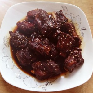 40分钟后,锅中的汤汁渐少,此时尝尝咸淡,如果不够咸,就加入盐搅匀。然后,改成大火收汤,待汤汁粘稠,可以包裹在排骨上即可。装盘后,撒一些熟的白芝麻装饰。