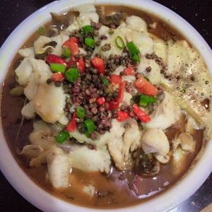 再倒入一些开水,开小火,把刚才腌制好的一片一片放入锅里,煮10分钟,看到鱼肉泛白就可以把鱼片倒入刚才盛鱼骨和鱼头的大碗里就行了。