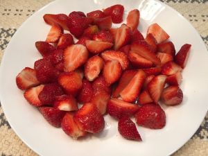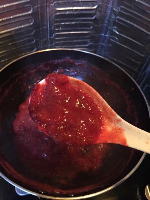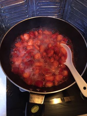直接倒入不粘锅加热,千万不要加水,因为草莓的汤汁是非常丰富的,用勺子压碎和搅拌