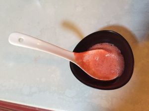 这是一杯草莓汁,它就是我这个懒人的杰作哈哈,果酱倒出来以后,熬制果酱的不粘锅不用刷,倒入一些矿泉水,直接加热,用勺子轻轻把锅壁上留下的果酱都刮下来,一杯美味的草莓汁就诞生了,锅也几乎干净了,简单清洗一下就可以了:)