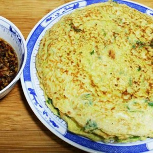 盛一勺面糊倒入平底锅内用铲子刮平成饼状,尽量刮匀不要薄厚相差太多