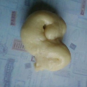 把面粉放进碗里,把酵母水倒进去,用手揉,最好“三光”。让面粉变得光滑
