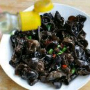 把焯过水的木耳盛到干净盘子里,倒入六月鲜酱油。