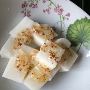 加入白砂糖。搅拌均匀,上火煮沸,加入泡软的琼脂,搅拌均匀,再次煮沸,关火。
