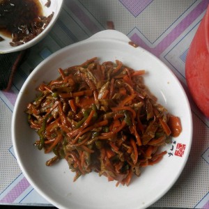 把肉么淀粉过油呈出 锅里放油放豆瓣酱葱姜蒜末翻炒 放肉萝卜丝青椒木耳 把鱼香肉丝汁放进去木耳提前泡上 图片忘放木耳了 抽完之后才发现